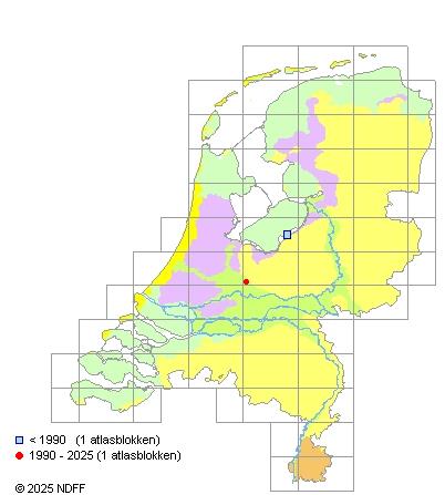 Het aantal atlasblokken (5x5 km) waarin de soort is gemeld binnen een periode van vijf jaar (vanaf 1980) of twintig jaar. Niet gecorrigeerd voor waarnemersinspanning en het aantal doorgegeven waarnemingen kan sterk variëren per periode, dus een trend in verspreiding kan hier niet direct uit worden afgelezen. Het opgegeven jaartal is het eerste jaar van de periode. Bron: gevalideerde waarnemingen uit de NDFF.