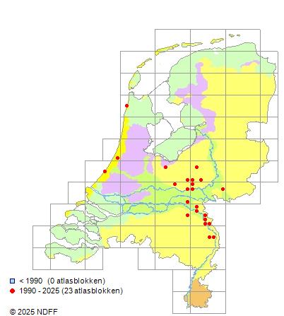 Het aantal atlasblokken (5x5 km) waarin de soort is gemeld binnen een periode van vijf jaar (vanaf 1980) of twintig jaar. Niet gecorrigeerd voor waarnemersinspanning en het aantal doorgegeven waarnemingen kan sterk variëren per periode, dus een trend in verspreiding kan hier niet direct uit worden afgelezen. Het opgegeven jaartal is het eerste jaar van de periode. Bron: gevalideerde waarnemingen uit de NDFF.
