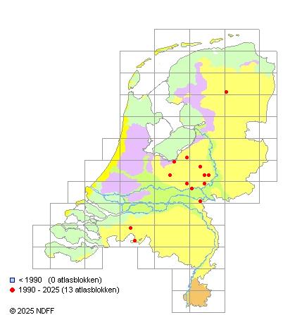 Het aantal atlasblokken (5x5 km) waarin de soort is gemeld binnen een periode van vijf jaar (vanaf 1980) of twintig jaar. Niet gecorrigeerd voor waarnemersinspanning en het aantal doorgegeven waarnemingen kan sterk variëren per periode, dus een trend in verspreiding kan hier niet direct uit worden afgelezen. Het opgegeven jaartal is het eerste jaar van de periode. Bron: gevalideerde waarnemingen uit de NDFF.