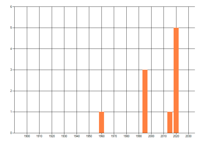 Het aantal atlasblokken (5x5 km) waarin de soort is gemeld binnen een periode van vijf jaar (vanaf 1980) of twintig jaar. Niet gecorrigeerd voor waarnemersinspanning en het aantal doorgegeven waarnemingen kan sterk variëren per periode, dus een trend in verspreiding kan hier niet direct uit worden afgelezen. Het opgegeven jaartal is het eerste jaar van de periode. Bron: gevalideerde waarnemingen uit de NDFF.