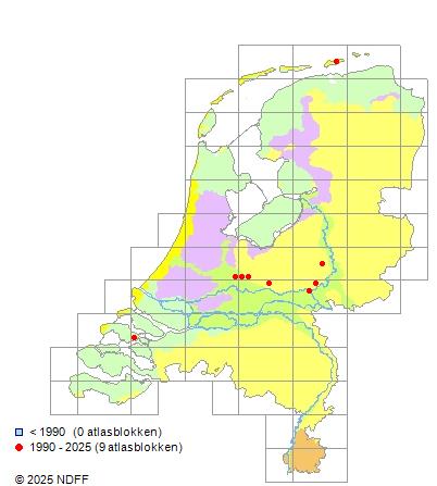Het aantal atlasblokken (5x5 km) waarin de soort is gemeld binnen een periode van vijf jaar (vanaf 1980) of twintig jaar. Niet gecorrigeerd voor waarnemersinspanning en het aantal doorgegeven waarnemingen kan sterk variëren per periode, dus een trend in verspreiding kan hier niet direct uit worden afgelezen. Het opgegeven jaartal is het eerste jaar van de periode. Bron: gevalideerde waarnemingen uit de NDFF.