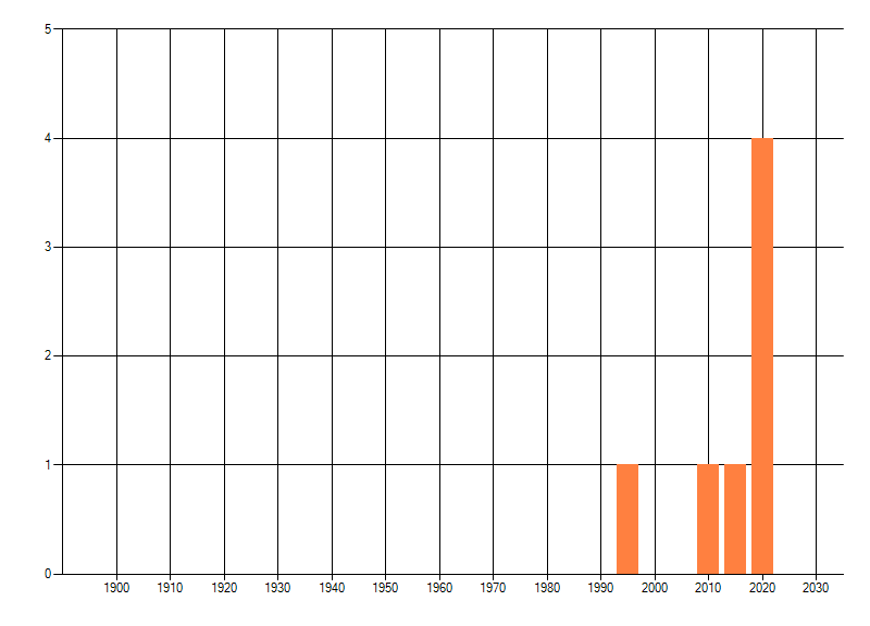 Het aantal atlasblokken (5x5 km) waarin de soort is gemeld binnen een periode van vijf jaar (vanaf 1980) of twintig jaar. Niet gecorrigeerd voor waarnemersinspanning en het aantal doorgegeven waarnemingen kan sterk variëren per periode, dus een trend in verspreiding kan hier niet direct uit worden afgelezen. Het opgegeven jaartal is het eerste jaar van de periode. Bron: gevalideerde waarnemingen uit de NDFF.