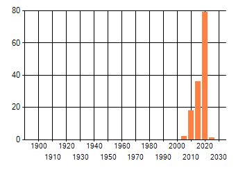 Het aantal atlasblokken (5x5 km) waarin de soort is gemeld binnen een periode van vijf jaar (vanaf 1980) of twintig jaar. Niet gecorrigeerd voor waarnemersinspanning en het aantal doorgegeven waarnemingen kan sterk variëren per periode, dus een trend in verspreiding kan hier niet direct uit worden afgelezen. Het opgegeven jaartal is het eerste jaar van de periode. Bron: gevalideerde waarnemingen uit de NDFF.