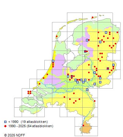 Het aantal atlasblokken (5x5 km) waarin de soort is gemeld binnen een periode van vijf jaar (vanaf 1980) of twintig jaar. Niet gecorrigeerd voor waarnemersinspanning en het aantal doorgegeven waarnemingen kan sterk variëren per periode, dus een trend in verspreiding kan hier niet direct uit worden afgelezen. Het opgegeven jaartal is het eerste jaar van de periode. Bron: gevalideerde waarnemingen uit de NDFF.