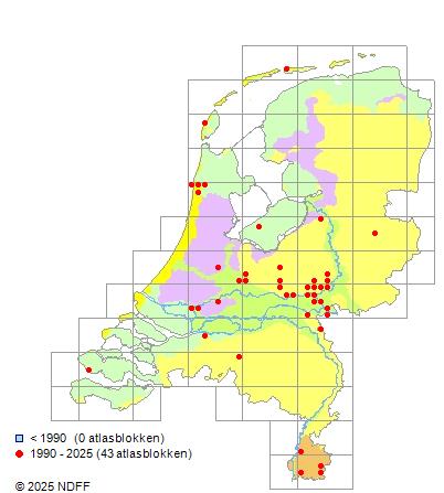 Het aantal atlasblokken (5x5 km) waarin de soort is gemeld binnen een periode van vijf jaar (vanaf 1980) of twintig jaar. Niet gecorrigeerd voor waarnemersinspanning en het aantal doorgegeven waarnemingen kan sterk variëren per periode, dus een trend in verspreiding kan hier niet direct uit worden afgelezen. Het opgegeven jaartal is het eerste jaar van de periode. Bron: gevalideerde waarnemingen uit de NDFF.