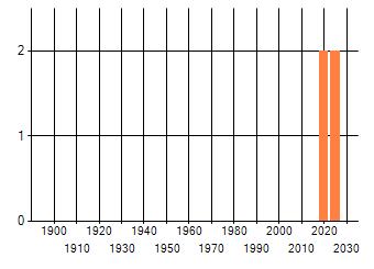 Het aantal atlasblokken (5x5 km) waarin de soort is gemeld binnen een periode van vijf jaar (vanaf 1980) of twintig jaar. Niet gecorrigeerd voor waarnemersinspanning en het aantal doorgegeven waarnemingen kan sterk variëren per periode, dus een trend in verspreiding kan hier niet direct uit worden afgelezen. Het opgegeven jaartal is het eerste jaar van de periode. Bron: gevalideerde waarnemingen uit de NDFF.