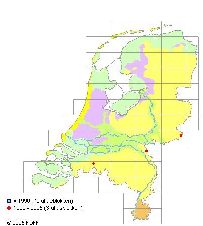 Het aantal atlasblokken (5x5 km) waarin de soort is gemeld binnen een periode van vijf jaar (vanaf 1980) of twintig jaar. Niet gecorrigeerd voor waarnemersinspanning en het aantal doorgegeven waarnemingen kan sterk variëren per periode, dus een trend in verspreiding kan hier niet direct uit worden afgelezen. Het opgegeven jaartal is het eerste jaar van de periode. Bron: gevalideerde waarnemingen uit de NDFF.