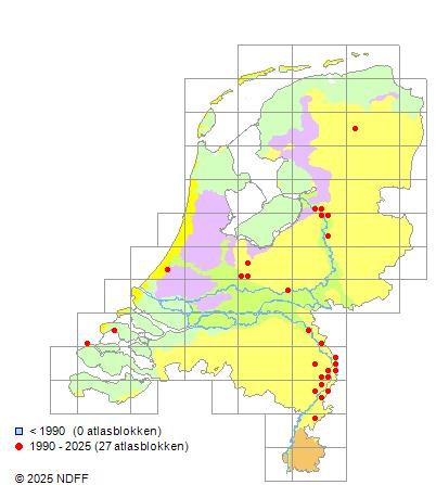 Het aantal atlasblokken (5x5 km) waarin de soort is gemeld binnen een periode van vijf jaar (vanaf 1980) of twintig jaar.