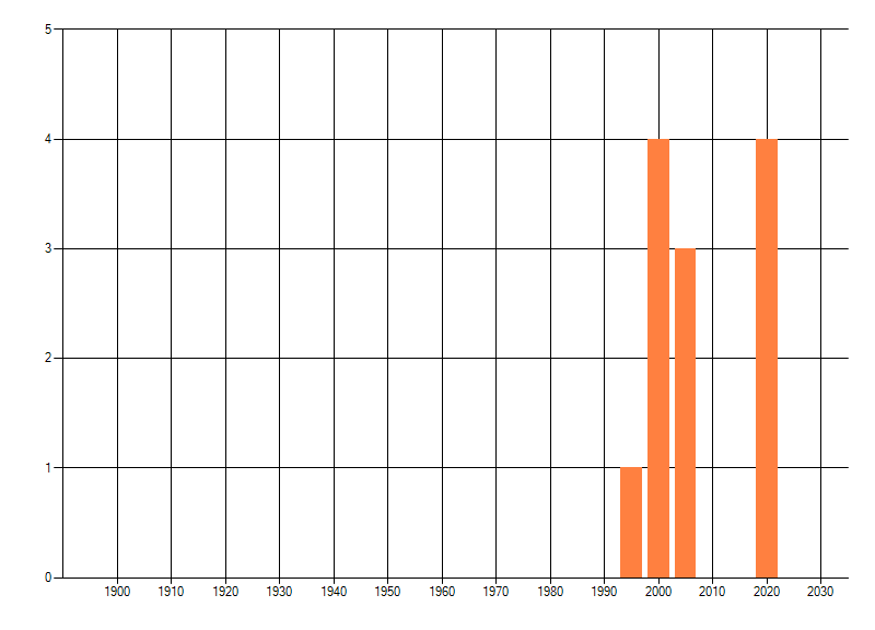 Het aantal atlasblokken (5x5 km) waarin de soort is gemeld binnen een periode van vijf jaar (vanaf 1980) of twintig jaar. Niet gecorrigeerd voor waarnemersinspanning en het aantal doorgegeven waarnemingen kan sterk variëren per periode, dus een trend in verspreiding kan hier niet direct uit worden afgelezen. Het opgegeven jaartal is het eerste jaar van de periode. Bron: gevalideerde waarnemingen uit de NDFF.