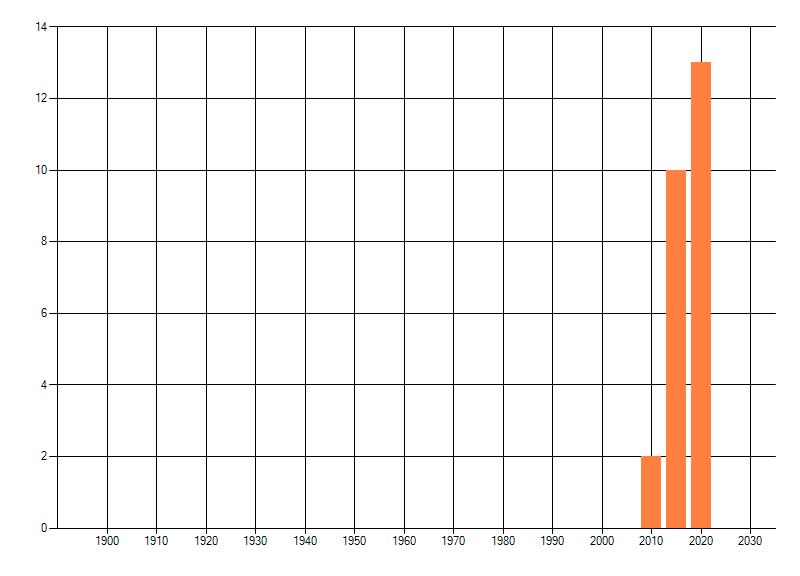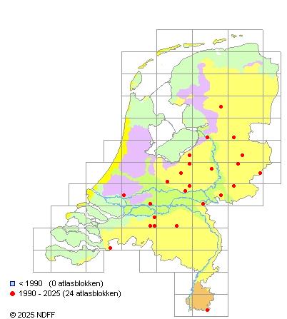 Het aantal atlasblokken (5x5 km) waarin de soort is gemeld binnen een periode van vijf jaar (vanaf 1980) of twintig jaar. Niet gecorrigeerd voor waarnemersinspanning en het aantal doorgegeven waarnemingen kan sterk variëren per periode, dus een trend in verspreiding kan hier niet direct uit worden afgelezen. Het opgegeven jaartal is het eerste jaar van de periode. Bron: gevalideerde waarnemingen uit de NDFF.