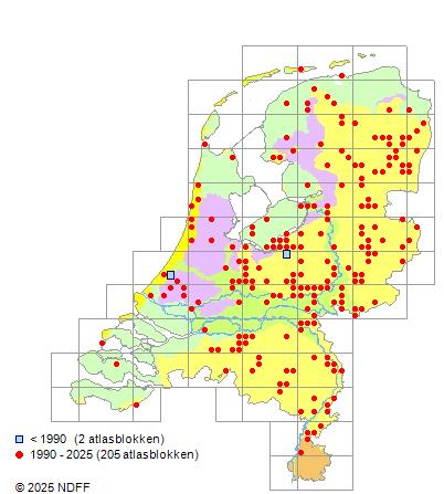 Het aantal atlasblokken (5x5 km) waarin de soort is gemeld binnen een periode van vijf jaar (vanaf 1980) of twintig jaar. Niet gecorrigeerd voor waarnemersinspanning en het aantal doorgegeven waarnemingen kan sterk variëren per periode, dus een trend in verspreiding kan hier niet direct uit worden afgelezen. Het opgegeven jaartal is het eerste jaar van de periode. Bron: gevalideerde waarnemingen uit de NDFF.