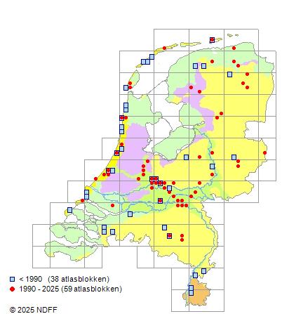 Het aantal atlasblokken (5x5 km) waarin de soort is gemeld binnen een periode van vijf jaar (vanaf 1980) of twintig jaar. Niet gecorrigeerd voor waarnemersinspanning en het aantal doorgegeven waarnemingen kan sterk variëren per periode, dus een trend in verspreiding kan hier niet direct uit worden afgelezen. Het opgegeven jaartal is het eerste jaar van de periode. Bron: gevalideerde waarnemingen uit de NDFF.