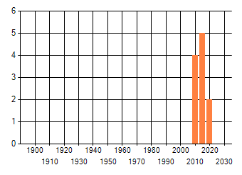 Het aantal atlasblokken (5x5 km) waarin de soort is gemeld binnen een periode van vijf jaar (vanaf 1980) of twintig jaar. Niet gecorrigeerd voor waarnemersinspanning en het aantal doorgegeven waarnemingen kan sterk variëren per periode, dus een trend in verspreiding kan hier niet direct uit worden afgelezen. Het opgegeven jaartal is het eerste jaar van de periode. Bron: gevalideerde waarnemingen uit de NDFF.