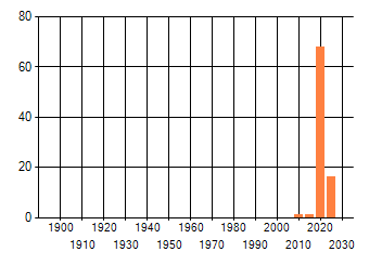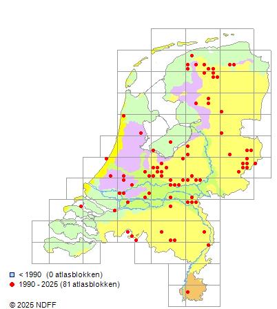 Het aantal atlasblokken (5x5 km) waarin de soort is gemeld binnen een periode van vijf jaar (vanaf 1980) of twintig jaar. Niet gecorrigeerd voor waarnemersinspanning en het aantal doorgegeven waarnemingen kan sterk variëren per periode, dus een trend in verspreiding kan hier niet direct uit worden afgelezen. Het opgegeven jaartal is het eerste jaar van de periode. Bron: gevalideerde waarnemingen uit de NDFF.