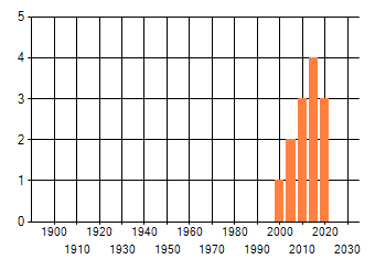 Het aantal atlasblokken (5x5 km) waarin de soort is gemeld binnen een periode van vijf jaar (vanaf 1980) of twintig jaar. Niet gecorrigeerd voor waarnemersinspanning en het aantal doorgegeven waarnemingen kan sterk variëren per periode, dus een trend in verspreiding kan hier niet direct uit worden afgelezen. Het opgegeven jaartal is het eerste jaar van de periode. Bron: gevalideerde waarnemingen uit de NDFF.
