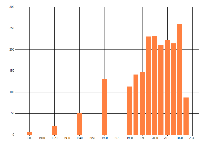 Het aantal atlasblokken (5x5 km) waarin de soort is gemeld binnen een periode van vijf jaar (vanaf 1980) of twintig jaar. Niet gecorrigeerd voor waarnemersinspanning en het aantal doorgegeven waarnemingen kan sterk variƫren per periode, dus een trend in verspreiding kan hier niet direct uit worden afgelezen. Het opgegeven jaartal is het eerste jaar van de periode. Bron: gevalideerde waarnemingen uit de NDFF.