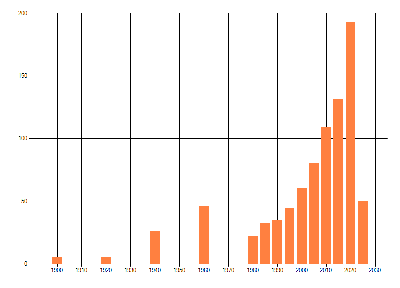 Het aantal atlasblokken (5x5 km) waarin de soort is gemeld binnen een periode van vijf jaar (vanaf 1980) of twintig jaar. Niet gecorrigeerd voor waarnemersinspanning en het aantal doorgegeven waarnemingen kan sterk variƫren per periode, dus een trend in verspreiding kan hier niet direct uit worden afgelezen. Het opgegeven jaartal is het eerste jaar van de periode. Bron: gevalideerde waarnemingen uit de NDFF.