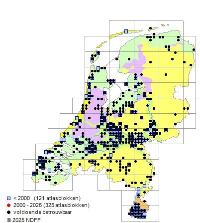 Het voor waarnemingsinspanning gecorrigeerde, of door een expert geschatte aantal atlasblokken (5x5 km) waarin de soort voorkomt per periode van tien jaar. Soms fluctueert het aantal sterk. Hoe vloeiender de lijn, des te betrouwbaarder de grafiek. Bron: Rode Lijst Mossen 2010. Ā© BLWG 2011