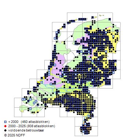 Het voor waarnemingsinspanning gecorrigeerde, of door een expert geschatte aantal atlasblokken (5x5 km) waarin de soort voorkomt per periode van tien jaar. Soms fluctueert het aantal sterk. Hoe vloeiender de lijn, des te betrouwbaarder de grafiek. Bron: Rode Lijst Mossen 2010. © BLWG 2011