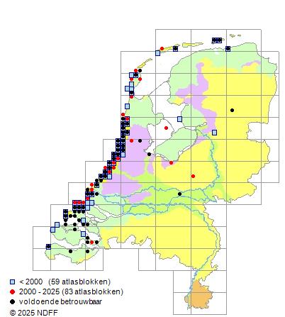 Het voor waarnemingsinspanning gecorrigeerde, of door een expert geschatte aantal atlasblokken (5x5 km) waarin de soort voorkomt per periode van tien jaar. Soms fluctueert het aantal sterk. Hoe vloeiender de lijn, des te betrouwbaarder de grafiek. Bron: Rode Lijst Mossen 2010. © BLWG 2011