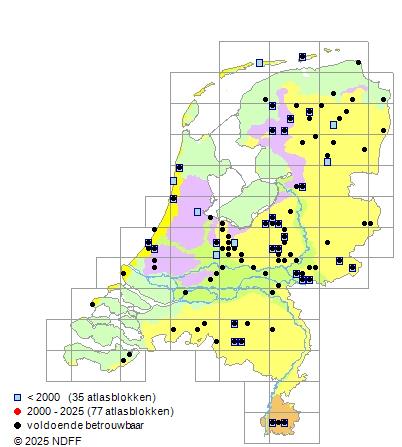 Het voor waarnemingsinspanning gecorrigeerde, of door een expert geschatte aantal atlasblokken (5x5 km) waarin de soort voorkomt per periode van tien jaar. Soms fluctueert het aantal sterk. Hoe vloeiender de lijn, des te betrouwbaarder de grafiek. Bron: Rode Lijst Mossen 2010. © BLWG 2011