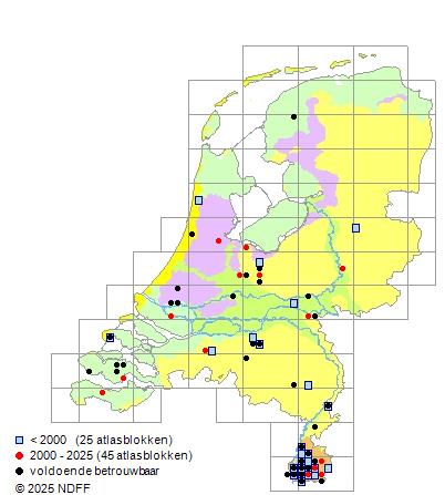Het voor waarnemingsinspanning gecorrigeerde, of door een expert geschatte aantal atlasblokken (5x5 km) waarin de soort voorkomt per periode van tien jaar. Soms fluctueert het aantal sterk. Hoe vloeiender de lijn, des te betrouwbaarder de grafiek. Bron: Rode Lijst Mossen 2010. © BLWG 2011