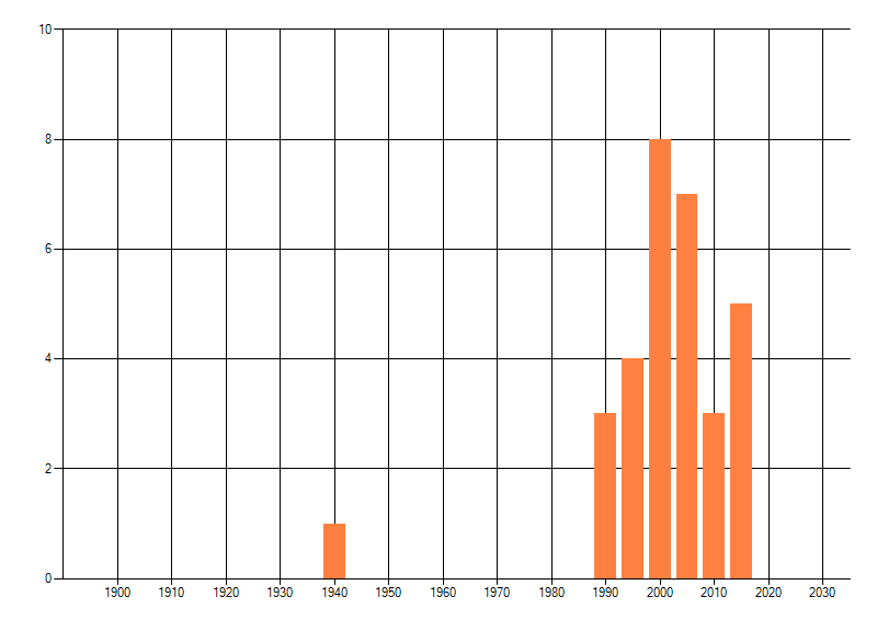 Het aantal atlasblokken (5x5 km) waarin de soort is gemeld binnen een periode van vijf jaar (vanaf 1980) of twintig jaar. Niet gecorrigeerd voor waarnemersinspanning en het aantal doorgegeven waarnemingen kan sterk variëren per periode, dus een trend in verspreiding kan hier niet direct uit worden afgelezen. Het opgegeven jaartal is het eerste jaar van de periode. Bron: gevalideerde waarnemingen uit de NDFF.