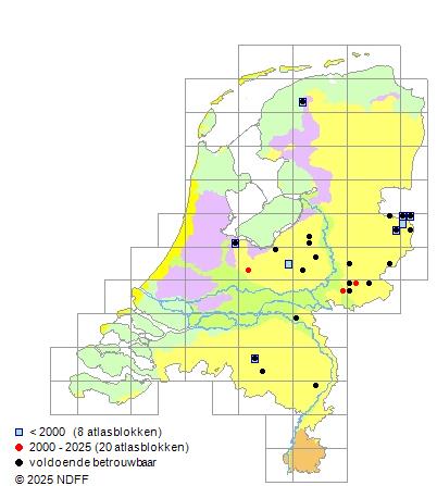 Het voor waarnemingsinspanning gecorrigeerde, of door een expert geschatte aantal atlasblokken (5x5 km) waarin de soort voorkomt per periode van tien jaar. Soms fluctueert het aantal sterk. Hoe vloeiender de lijn, des te betrouwbaarder de grafiek. Bron: Rode Lijst Mossen 2010. © BLWG 2011
