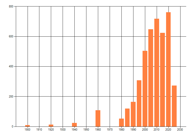 Het aantal atlasblokken (5x5 km) waarin de soort is gemeld binnen een periode van vijf jaar (vanaf 1980) of twintig jaar. Niet gecorrigeerd voor waarnemersinspanning en het aantal doorgegeven waarnemingen kan sterk variëren per periode, dus een trend in verspreiding kan hier niet direct uit worden afgelezen. Het opgegeven jaartal is het eerste jaar van de periode. Bron: gevalideerde waarnemingen uit de NDFF.