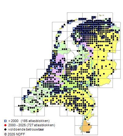 Het voor waarnemingsinspanning gecorrigeerde, of door een expert geschatte aantal atlasblokken (5x5 km) waarin de soort voorkomt per periode van tien jaar. Soms fluctueert het aantal sterk. Hoe vloeiender de lijn, des te betrouwbaarder de grafiek. Bron: Rode Lijst Mossen 2010. © BLWG 2011