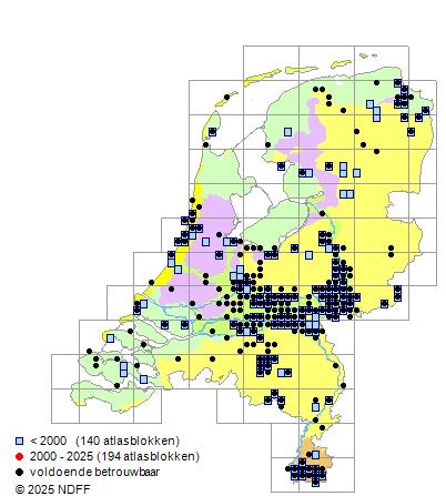 Het aantal atlasblokken (5x5 km) waarin de soort is gemeld binnen een periode van vijf jaar (vanaf 1980) of twintig jaar. Niet gecorrigeerd voor waarnemersinspanning en het aantal doorgegeven waarnemingen kan sterk variëren per periode, dus een trend in verspreiding kan hier niet direct uit worden afgelezen. Het opgegeven jaartal is het eerste jaar van de periode. Bron: gevalideerde waarnemingen uit de NDFF.