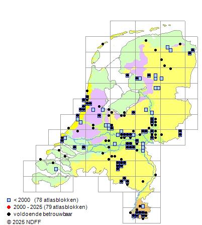 Het voor waarnemingsinspanning gecorrigeerde, of door een expert geschatte aantal atlasblokken (5x5 km) waarin de soort voorkomt per periode van tien jaar. Soms fluctueert het aantal sterk. Hoe vloeiender de lijn, des te betrouwbaarder de grafiek. Bron: Rode Lijst Mossen 2010. © BLWG 2011