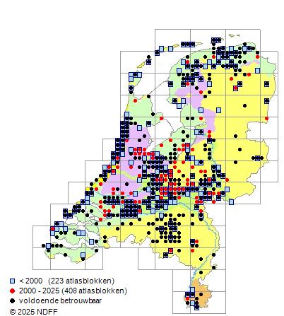 Het voor waarnemingsinspanning gecorrigeerde, of door een expert geschatte aantal atlasblokken (5x5 km) waarin de soort voorkomt per periode van tien jaar. Soms fluctueert het aantal sterk. Hoe vloeiender de lijn, des te betrouwbaarder de grafiek. Bron: Rode Lijst Mossen 2010. © BLWG 2011
