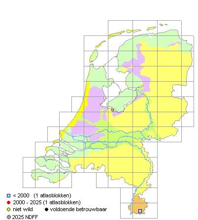 Het aantal atlasblokken (5x5 km) waarin de soort is gemeld binnen een periode van vijf jaar (vanaf 1980) of twintig jaar. Niet gecorrigeerd voor waarnemersinspanning en het aantal doorgegeven waarnemingen kan sterk variëren per periode, dus een trend in verspreiding kan hier niet direct uit worden afgelezen. Het opgegeven jaartal is het eerste jaar van de periode. Bron: gevalideerde waarnemingen uit de NDFF.