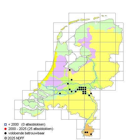 Het aantal atlasblokken (5x5 km) waarin de soort is gemeld binnen een periode van vijf jaar (vanaf 1980) of twintig jaar. Niet gecorrigeerd voor waarnemersinspanning en het aantal doorgegeven waarnemingen kan sterk variëren per periode, dus een trend in verspreiding kan hier niet direct uit worden afgelezen. Het opgegeven jaartal is het eerste jaar van de periode. Bron: gevalideerde waarnemingen uit de NDFF.