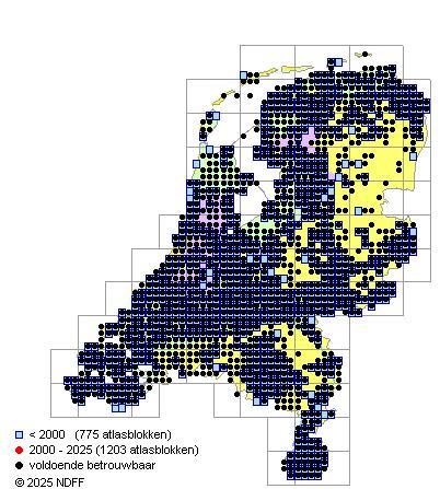 Het aantal atlasblokken (5x5 km) waarin de soort is gemeld binnen een periode van vijf jaar (vanaf 1980) of twintig jaar. Niet gecorrigeerd voor waarnemersinspanning en het aantal doorgegeven waarnemingen kan sterk variëren per periode, dus een trend in verspreiding kan hier niet direct uit worden afgelezen. Het opgegeven jaartal is het eerste jaar van de periode. Bron: gevalideerde waarnemingen uit de NDFF.