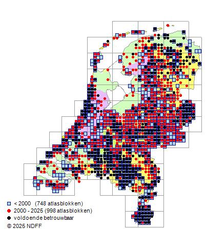 Het voor waarnemingsinspanning gecorrigeerde, of door een expert geschatte aantal atlasblokken (5x5 km) waarin de soort voorkomt per periode van tien jaar. Soms fluctueert het aantal sterk. Hoe vloeiender de lijn, des te betrouwbaarder de grafiek. Bron: Rode Lijst Mossen 2010. Ā© BLWG 2011