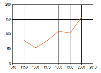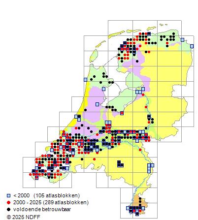 Het voor waarnemingsinspanning gecorrigeerde, of door een expert geschatte aantal atlasblokken (5x5 km) waarin de soort voorkomt per periode van tien jaar. Soms fluctueert het aantal sterk. Hoe vloeiender de lijn, des te betrouwbaarder de grafiek. Bron: Rode Lijst Mossen 2010. © BLWG 2011