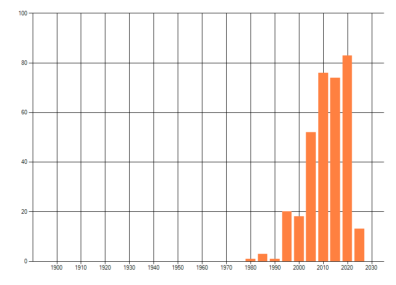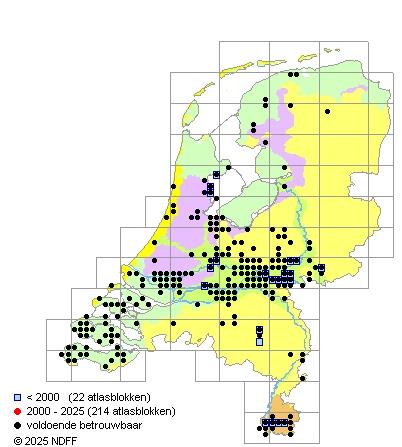 Het aantal atlasblokken (5x5 km) waarin de soort is gemeld binnen een periode van vijf jaar (vanaf 1980) of twintig jaar. Niet gecorrigeerd voor waarnemersinspanning en het aantal doorgegeven waarnemingen kan sterk variëren per periode, dus een trend in verspreiding kan hier niet direct uit worden afgelezen. Het opgegeven jaartal is het eerste jaar van de periode. Bron: gevalideerde waarnemingen uit de NDFF.