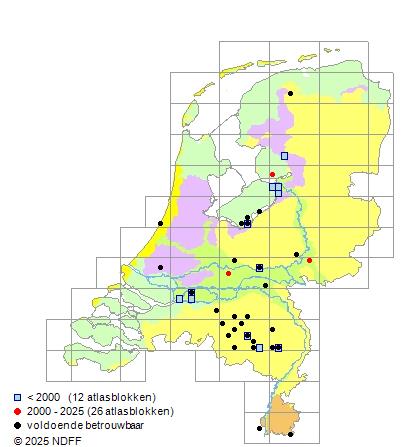 Het voor waarnemingsinspanning gecorrigeerde, of door een expert geschatte aantal atlasblokken (5x5 km) waarin de soort voorkomt per periode van tien jaar. Soms fluctueert het aantal sterk. Hoe vloeiender de lijn, des te betrouwbaarder de grafiek. Bron: Rode Lijst Mossen 2010. © BLWG 2011