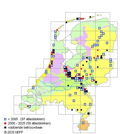 Het voor waarnemingsinspanning gecorrigeerde, of door een expert geschatte aantal atlasblokken (5x5 km) waarin de soort voorkomt per periode van tien jaar. Soms fluctueert het aantal sterk. Hoe vloeiender de lijn, des te betrouwbaarder de grafiek. Bron: Rode Lijst Mossen 2010. © BLWG 2011