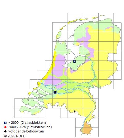 Het voor waarnemingsinspanning gecorrigeerde, of door een expert geschatte aantal atlasblokken (5x5 km) waarin de soort voorkomt per periode van tien jaar. Soms fluctueert het aantal sterk. Hoe vloeiender de lijn, des te betrouwbaarder de grafiek. Bron: Rode Lijst Mossen 2010. © BLWG 2011