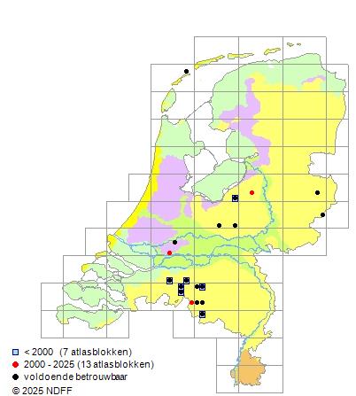 Het voor waarnemingsinspanning gecorrigeerde, of door een expert geschatte aantal atlasblokken (5x5 km) waarin de soort voorkomt per periode van tien jaar. Soms fluctueert het aantal sterk. Hoe vloeiender de lijn, des te betrouwbaarder de grafiek. Bron: Rode Lijst Mossen 2010. © BLWG 2011