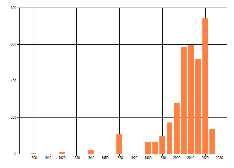 Het aantal atlasblokken (5x5 km) waarin de soort is gemeld binnen een periode van vijf jaar (vanaf 1980) of twintig jaar. Niet gecorrigeerd voor waarnemersinspanning en het aantal doorgegeven waarnemingen kan sterk variëren per periode, dus een trend in verspreiding kan hier niet direct uit worden afgelezen. Het opgegeven jaartal is het eerste jaar van de periode. Bron: gevalideerde waarnemingen uit de NDFF.