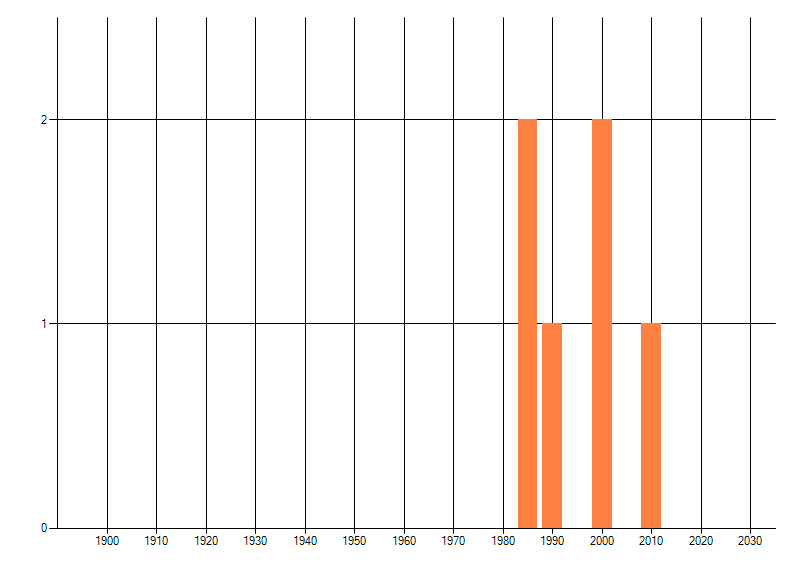 Het aantal atlasblokken (5x5 km) waarin de soort is gemeld binnen een periode van vijf jaar (vanaf 1980) of twintig jaar. Niet gecorrigeerd voor waarnemersinspanning en het aantal doorgegeven waarnemingen kan sterk variëren per periode, dus een trend in verspreiding kan hier niet direct uit worden afgelezen. Het opgegeven jaartal is het eerste jaar van de periode. Bron: gevalideerde waarnemingen uit de NDFF.