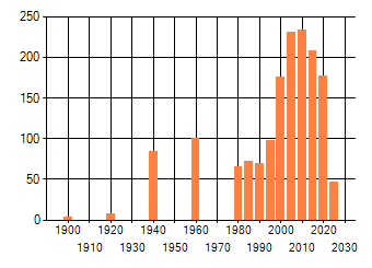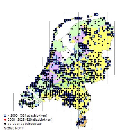Het aantal atlasblokken (5x5 km) waarin de soort is gemeld binnen een periode van vijf jaar (vanaf 1980) of twintig jaar. Niet gecorrigeerd voor waarnemersinspanning en het aantal doorgegeven waarnemingen kan sterk variëren per periode, dus een trend in verspreiding kan hier niet direct uit worden afgelezen. Het opgegeven jaartal is het eerste jaar van de periode. Bron: gevalideerde waarnemingen uit de NDFF.