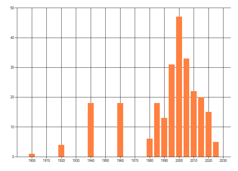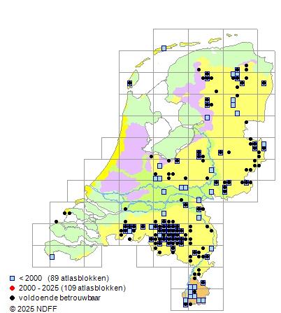 Het aantal atlasblokken (5x5 km) waarin de soort is gemeld binnen een periode van vijf jaar (vanaf 1980) of twintig jaar. Niet gecorrigeerd voor waarnemersinspanning en het aantal doorgegeven waarnemingen kan sterk variëren per periode, dus een trend in verspreiding kan hier niet direct uit worden afgelezen. Het opgegeven jaartal is het eerste jaar van de periode. Bron: gevalideerde waarnemingen uit de NDFF.