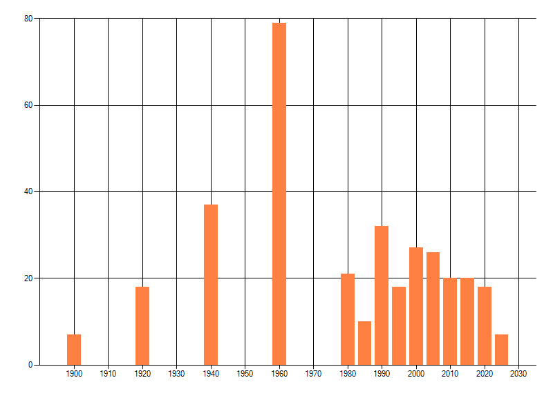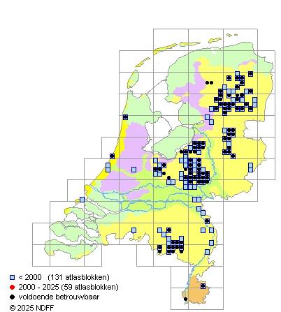 Het aantal atlasblokken (5x5 km) waarin de soort is gemeld binnen een periode van vijf jaar (vanaf 1980) of twintig jaar. Niet gecorrigeerd voor waarnemersinspanning en het aantal doorgegeven waarnemingen kan sterk variƫren per periode, dus een trend in verspreiding kan hier niet direct uit worden afgelezen. Het opgegeven jaartal is het eerste jaar van de periode. Bron: gevalideerde waarnemingen uit de NDFF.