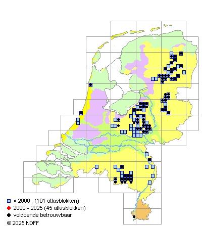 Het voor waarnemingsinspanning gecorrigeerde, of door een expert geschatte aantal atlasblokken (5x5 km) waarin de soort voorkomt per periode van tien jaar. Soms fluctueert het aantal sterk. Hoe vloeiender de lijn, des te betrouwbaarder de grafiek. Bron: Rode Lijst Mossen 2010. © BLWG 2011