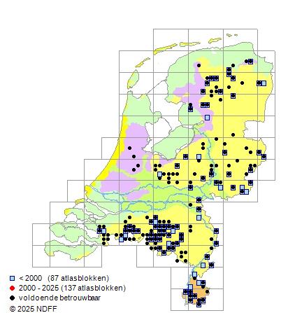 Het voor waarnemingsinspanning gecorrigeerde, of door een expert geschatte aantal atlasblokken (5x5 km) waarin de soort voorkomt per periode van tien jaar. Soms fluctueert het aantal sterk. Hoe vloeiender de lijn, des te betrouwbaarder de grafiek. Bron: Rode Lijst Mossen 2010. © BLWG 2011